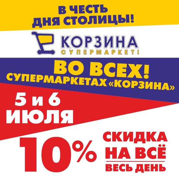 Дорогие подписчики! 5 и 6 июля в сети супермаркетов «Корзина» проходит акция в честь Дня Столицы Республики Казахстан! СКИДКА ВЕСЬ ДЕНЬ — 10% А Вы успели совершить покупки со скидкой 10%?