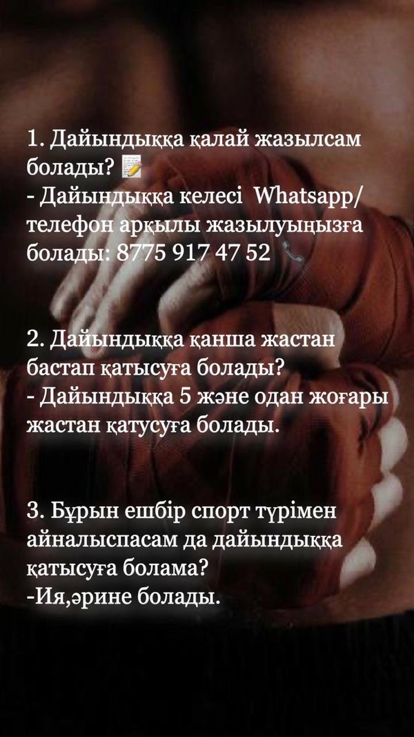 АССАЛАМУҒАЛЕЙКУМ ЖІГІТТЕР. ХАБАРЛАНДЫРУ!!! ⤵️⤵️⤵️ Ин ша Аллаһ тамыз айының 23-і дайындығымызды бастаймыз Осы жолы дайындық мүлдем басқа форматта өтетін болады, физикалық, техникалық деңгейіне байланысты және профқа бөлек группа дайындайтын боламын, сол үшін 18 ден асқан кәсіби (профқа) шыққысы келетін,көзінде оты жанып тұрған намысты қазақ жігіттері керек!!! Ең бірінші қатысушыларға талабым: үйренемін,мықты боламын деген ниеті болса болғаны, Ин ша Аллаһ техникасы мен физика т.с.с жағын дайындаймын!!! Біздің “КӨКЖАЛ” клубымыз құрылғ… — Читать дальше