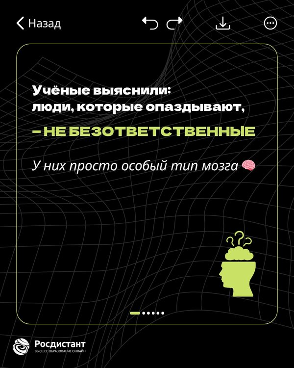 Вы из тех, кто всегда говорит «я уже выхожу», хотя ещё даже не встали из-за стола? Не спешите себя ругать — возможно, ваш мозг просто работает иначе. Учёные выяснили, что люди, которые постоянно опаздывают, не безответственные. Они просто по-другому ощущают время — и часто обладают особым типом мышления. Что это значит и почему среди «опоздунов» столько креативных людей — рассказываем в карточках (и да, теперь у вас есть научное оправдание)