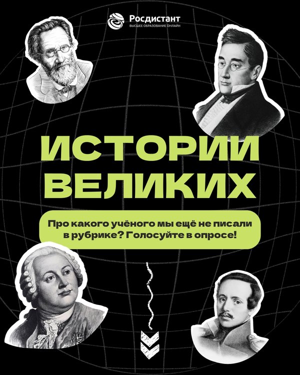 В рубрике #Истории_великих@rosdistant мы уже рассказывали о многих известных учёных и мыслителях. А теперь передаём слово вам! Посмотрите на карточку и проголосуйте в опросе: про кого мы еще не писали? И. Мечников, М. Ломоносов, А. Грибоедов, М. Лермонтов? P.S: все посты рубрики легко найти по хэштегу #Истории_великих@rosdistant