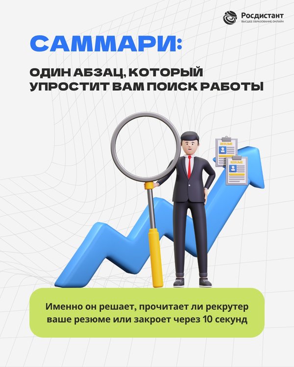 У вас может быть крутое резюме… но если рекрутер за 10 секунд не понял, кто вы — он его даже не откроет. Саммари решает эту проблему. Это один абзац, который показывает вашу ценность с первых строк. Показываем в карточках, как его написать