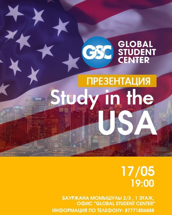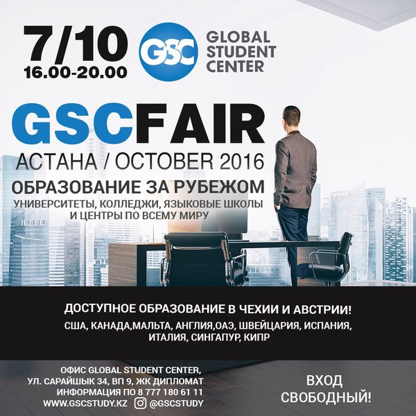 @gscstudy проводит 4-ую образовательную выставку в Астане! Образование по всему миру! Университеты, колледжи, языковые школы, программы бакалавра и магистратуры! Наши партнёры приедут из Великобритании, Испании, Швейцарии, Китая, Ирландии, Шотландии, Чехии, Австрии, США, Канады и других стран! Астана: 7 октября, головной центр Global Student Center, ул. Сарайшык 34/9, вход с улицы Акмешит. С 16.00 до 20.00! Вход свободный! Справки по тел.: Обучение в других странах мира это реальность! Исполни свою мечту с @gscstudy