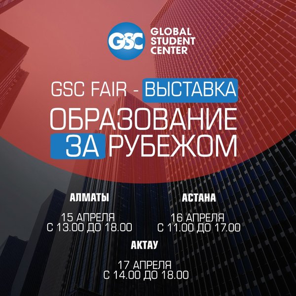 енка, братишки или сестренки, то мы думаем это выставка именно для вас! У вас есть возможность встретиться на прямую с представителями университетов, школ и получить информацию от первоисточников! И конечно же не стоит забывать о скидках и стипендиях, доступных только студентам Global Student Center! Вы рассматриваете специальности бизнеса, инженерии, биотехнологии, нанотехнологии, инженерии, строительства, кулинарии, журналистки, дизайна — это лишь не большая часть списка сфер, которые будут представлены на выставке «Образование за рубежом» Global Student Center не обещает скорость, мы обещаем результат! Вход на выставку во всех городах свободный! 15 апреля, с 13.00 до 18.00, г. Алматы, офис Global Student Center (Ул. Наурызбай Батыра 99/1, выше улицы Шевченко, ЖК Шанырак) Телефоны:, 311 52 22 16 Апреля, с 11.00 до 17.00 г. Астана, офис Global Student Center (Ул. Бауржан Момышулы 2/3 офис 1 в здании Альфа Банка). Телефоны:, Апреля, с 14.00 до 17.00 г. Актау, Отель Ренессанс, 9 Микро район, Телефоны: