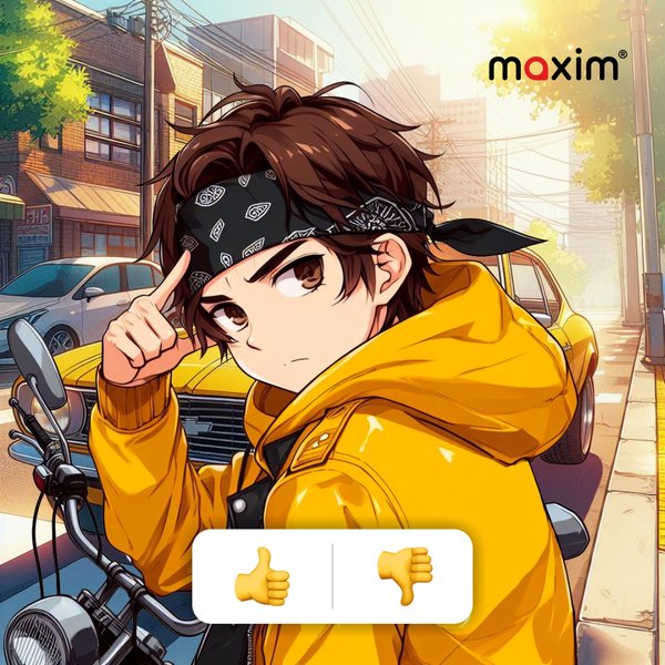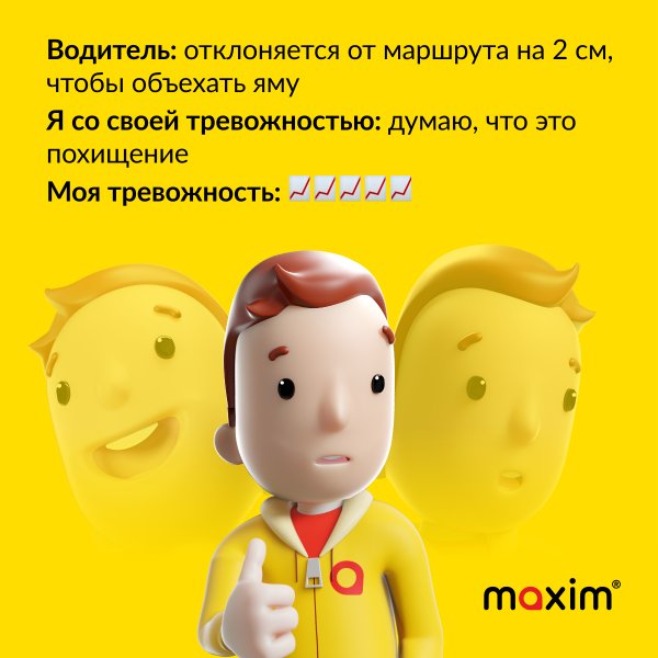 Бұл жүогізуші Азамат. Әр таң сайын ол сені жылдам және ыңғайлылықпен жұмысқа жеткізу үшін оянады. Одан кейін түсте кафеге. Одан кейін үйге. Сапардың соңында жүргізушіге жақсы баға қоюды ұмытпа, ол тырысты. Әр сапар сайын қосымшада қызмет сапасын бағалауды ұсынатын экран пайда болады. — егер бәрі жақсы болса; — егер бірнәрсе ұнамаса қой. Сенің бағаң Maxim жақсартуға көмектеседі.