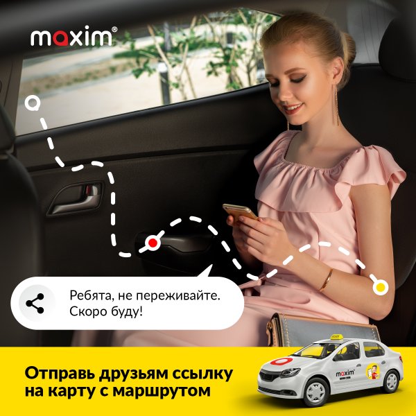 Maxim сапарлар қауіпсіз. Жүргізушінің барлық қозғалыстары тіркеледі, оны картадан бақылауға болады. Сіз жүргізушінің есімі мен суретін, көлік құралының маркасы мен номерін көресіз. Тапсырыстар тарихы сіздің қосымшаңызда сақталады. Бірақ өзіңізді сенімдірек сезіну үшін сізді қадағалай алатын адамға сапар тргеін жіберіңіз. Қосымшада «бөлісу» батырмасын басып, қалай және кімге сілтемені жіберу керектігін таңдау керек. Сіздің танысыңыз картадан сіздің тура қазір қай жерде кетіп бара жатқандығыңызды көре алады.