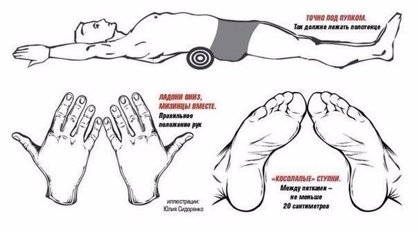 алик длиной не менее 40 сантиметров и толщиной 7–10 сантиметров. Перевязываем валик крепкой ниткой, чтобы не размотался. 2. Садимся на достаточно твердую горизонтальную поверхность (мягкая кровать не подойдет, лучше лежать на кушетке, массажном столе или просто на туристическом коврике на полу), кладем свернутый валик. 3. Аккуратно опускаемся на спину, придерживая валик руками так, чтобы он оказался поперек тела под поясницей – ровно под пупком. Это важно. 4. Ноги кладем на ширину плеч и «косолапо» сводим стопы вместе – так, чтобы большие пальцы касались друг друга, а пятки были на расстоянии 20–25 сантиметров. 5. Заводим вытянутые прямые руки за голову, поворачиваем их ладонями вниз и соединяем между собой мизинцами. Поза достаточно неудобная, если вам сложно распрямить руки полностью, не страшно, пусть лежат, как получается. Главное, следить, чтобы соприкасались большие пальцы ног и мизинцы рук. 6. Лежим в таком положении 5 минут. Если все сделано правильно, ваш скелет начнет немедленно принимать естественную для него форму – и вы ощутите, как живот чудесным образом «втягивается» внутрь тела. Однако этот процесс может быть болезненным. Если вам слишком сложно сразу выдержать пять минут, начинайте с минуты-двух, каждый день увеличивая время «отдыха на валике». Результаты станут заметны окружающим примерно через месяц. (!) За время каждого сеанса кости и суставы слегка сдвигаются с места, поэтому вставать с полотенца нужно очень аккуратно, без резких движений.