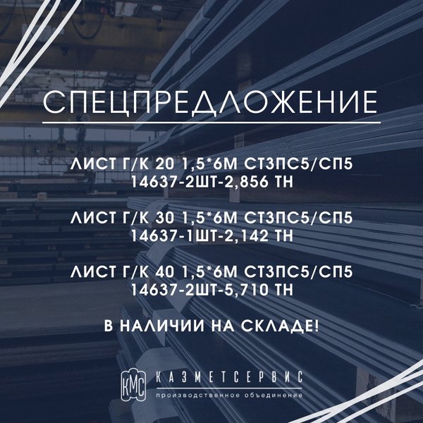 Спецпредложение Лист Г/К 20 1,5*6м ст3пс5/сп5 14637-2шт-2,856 тн Лист Г/К 30 1,5*6м ст3пс5/сп5 14637-1шт-2,142 тн Лист Г/К 40 1,5*6м ст3пс5/сп5 14637-2шт-5,710 тн В наличии на складе в Астане! доставка нестандартного груза минимальная партия – 1 кг, 1 лист, 1 хлыст собственный автопарк и современная инфраструктура складов обработка металлов (резка, оцинковка, гибка) ТОО «ПО КазМетСервис» реализует продукцию оптом и в розницу. Если Вас интересуют объемы и скидки, а также если Вы не нашли нужную позицию – позвоните нашим менеджерам, они п… — Читать дальше