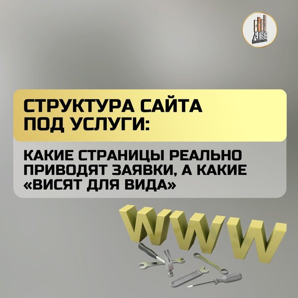 которые «висят для вида»: — общий текст «мы оказываем услуги»; — без примеров и доказательств; — без структуры и сценария; — без конкретного шага к заявке. Структура сайта — это не про красоту. Это про то, чтобы клиент дошёл до действия. Оставьте заявку на бесплатную консультацию в ABS-Marketing — разберём структуру сайта и покажем, какие страницы стоит усилить в первую очередь.