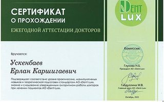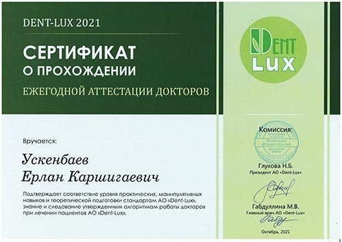 2021 — Прохождение ежегодной аттестации докторов, организатор Dent–Lux, г. Алматы;