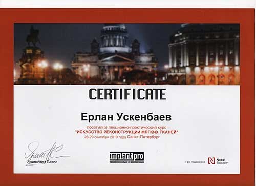 2018 — «Одномоментная имплантация и немедленная нагрузка в различных клинических случаях. Прогнозируемый и эстетический результат», организатор Nobel Biocare, г. Астана;