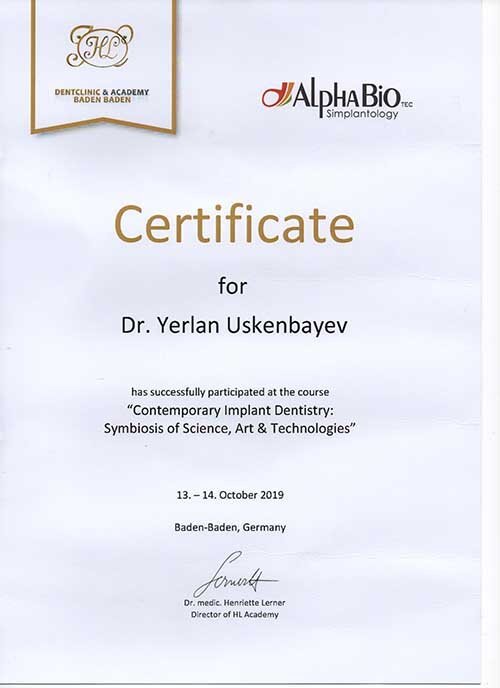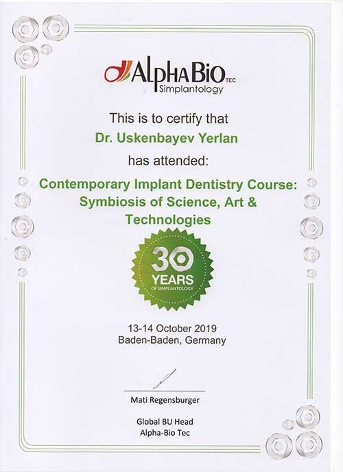 2019 — «Contemporary Implant Dentistry: Symbiosis of Science, Art & Technologies», организатор At Alpha–Bio Tec. совместнос HL Dentclinic & Academy Baden Baden, спикер Mati Regensburger, г. Баден–Баден, Германия;