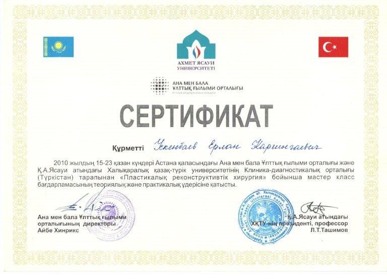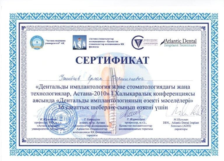 2010 — Повышение квалификации по теме «Актуальные вопросы хирургической стоматологии и челюстно–лицевой хирургии», организатор Казахский Медицинский Университет Непрерывного Образования (АГИУВ), г. Алматы;