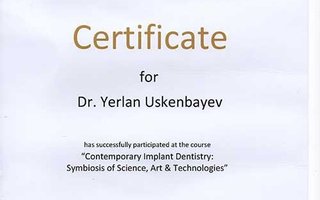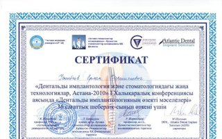 2015 — Мастер–класс «Aesthetic & Functional Dentistry», организаторАлматинскийстоматологическийинститутпоследипломногообучениясовместнос «АстраДент», Dr. Marton Yakubovich (Master of science implantologie, Specialist of implantology EDA, DGZI, BDIZ, Prooved expert for implantology DGOI, Speaker and specialist adviser for all implantology organizations of Germany), г. Алматы;