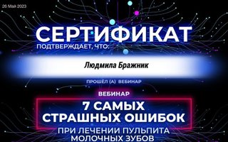 2023 — Авторский курс «Семь самых страшных ошибок при лечении пульпита молочных зубов», спикер и автор Адаева Наталья, г. Кокшетау;
