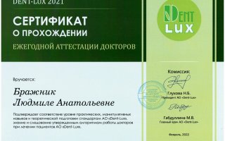 Людмила Анатольевна регулярно проходит повышение квалификации, посещая семинары, тренинги, мастер–классы и международные конгрессы признанных стоматологов в мировом врачебном сообществе. За плечами доктора обучение у опытных и признанных экспертов, таких как Адаева Наталья, Геранин Станислав и другие.... Показать еще