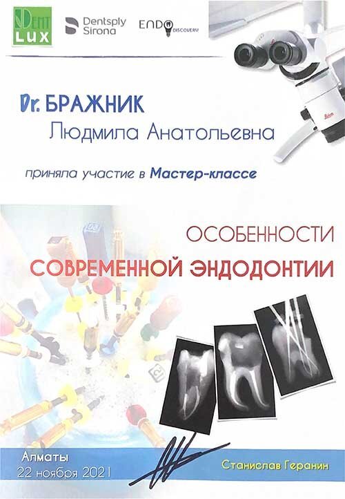 2021 — «Основы вертикальной конденсации при проведении эндодонтического лечения пациента», внутреннее обучение Dent–Lux, лектор Габдуллина М. В., г. Алматы;