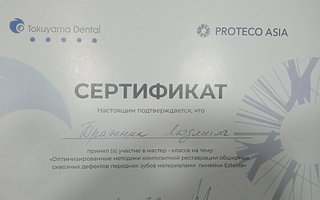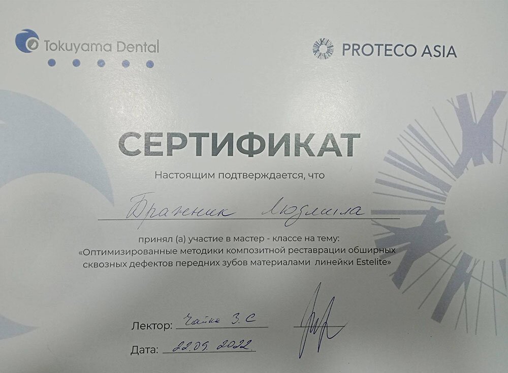 2022 — «Оптимизированные методики композитной реставрации обширных сквозных дефектов передних зубов материалами линейки Estelite», организатор Tokuyama Dental совместно с компанией Proteco Asiya, лектор Чайка З. С., г. Кокшетау;