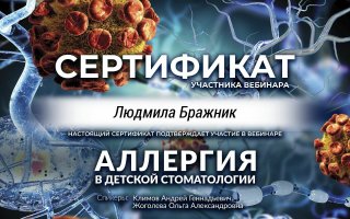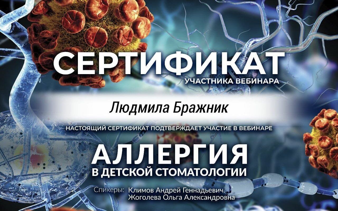Стоматолог-терапевт (детский прием)Бражник Людмила Анатольевна – опытный и профессиональный стоматолог–терапевт, специализирующийся на диагностике и комплексном лечении различных заболеваний полости рта, таких как кариес и его осложнения (пульпит, периодонтит) молочных и постоянных зубов, проводит гигиеническую чистку зубов, эффективно удаляя зубной налет со всех зубных поверхностей, в том числе на труднодоступных участках. Кроме того, успешно проводит герметизацию фиссур, реализует программы по укреплению зубов с использованием передовых методик, таких как применение кальция и фтора. Обладает безупречными навыками восстановления зубов при помощи эстетико–функциональной реставрации любой сложности с применением самых инновационных и эффективных методов в соответствии с международными протоколами. Одним из ее главных преимуществ является использование системы изоляции рабочего поля – раббердама, что позволяет ей выполнять манипуляции с высокой точностью и обеспечивает высокое качество лечения.