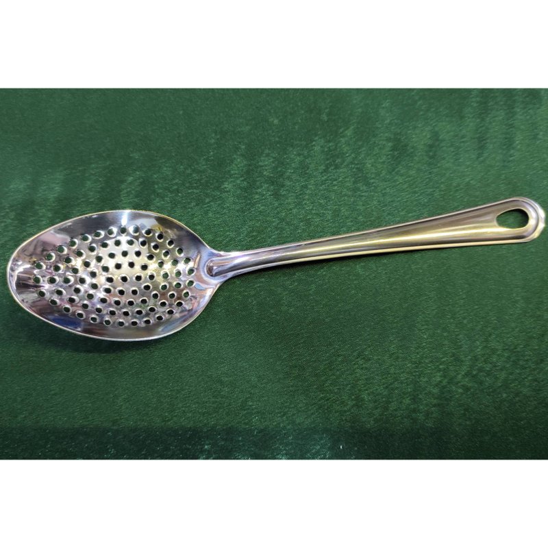 Из нержавеющей стали. Высота 25 сантиметров. Отверстие на кухонной ложке удобно для подвешивания и хранения...