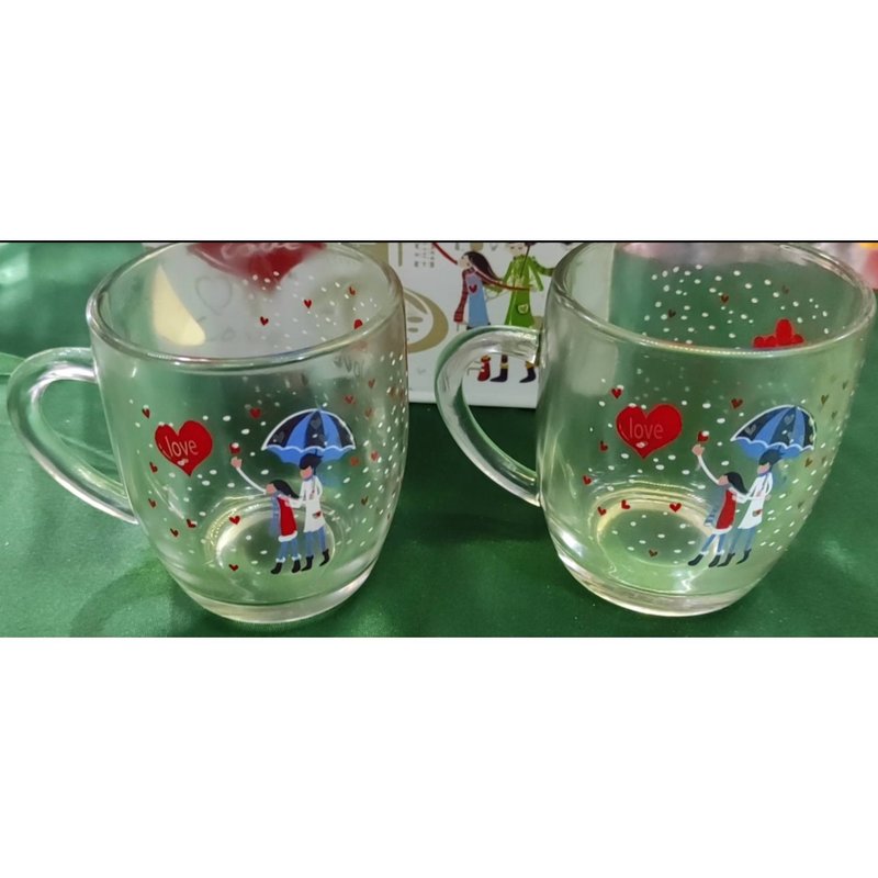 Две стеклянные, прозрачные кружки с рисунком девочка с мальчиком под зонтом, сердечки и снег.