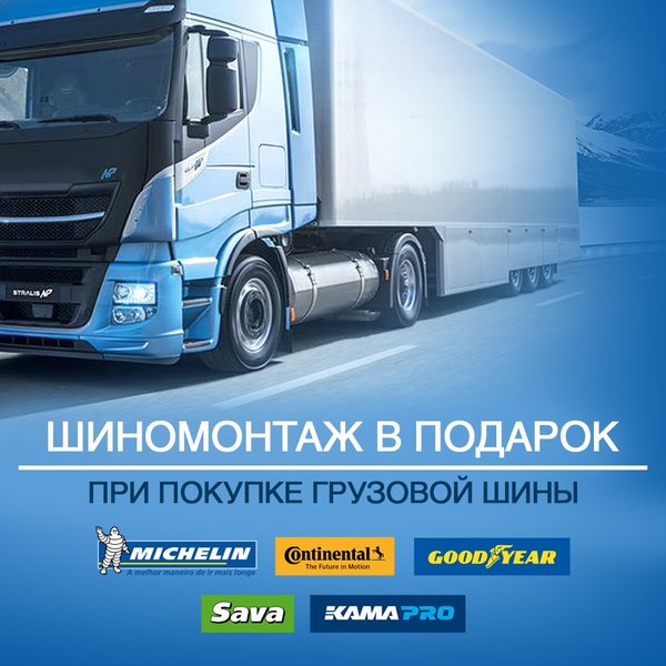 Дарим шиномонтаж при покупке от 2х штук грузовой шины посадочного диаметра R22.5 брендов Michelin, Continental, Goodyear, Sava, KAMA PRO. Подробности и условия акции у нас на сайте в разделе «Акции и скидки» или по номеру 3015 бесплатный звонок по РК.
