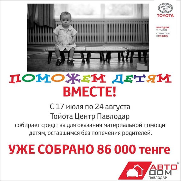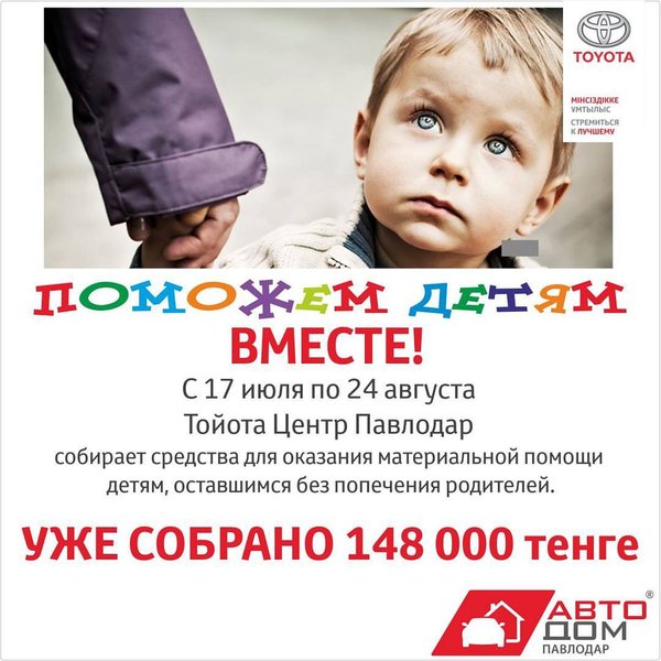Елена Матяш (02.08.2017): 17 июля в Тойота Центр Павлодар стартовала акция «Поможем детям вместе», в рамках которой с каждого чеклиста заезжающего на сервис автомобиля передаются денежные средства в фонд детского дома. На сегодняшний день собрано 86 000 тенге. Подробный фотоотчет о вручении средств мы обязательно выложим в лентах в социальных сетях и на официальном сайте Тойота Центр Павлодар. Следите за нашими новостями! детямвместе Тойота Центр Павлодар