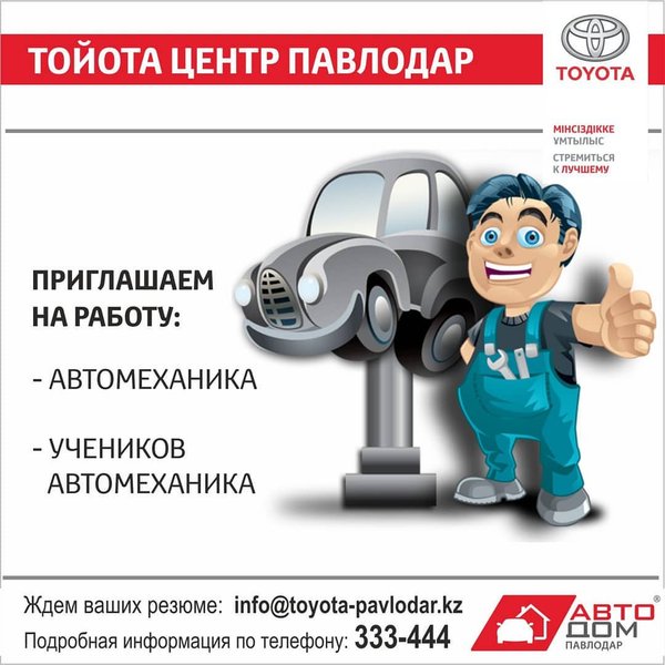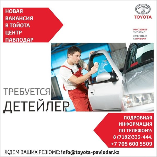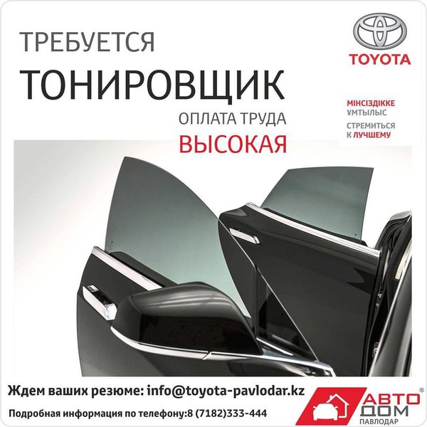 В связи с расширением штата Тойота Центр Павлодар приглашает на работу тонировщика. Основные требования: профессионализм, аккуратность, ответственность, высокая работоспособность.