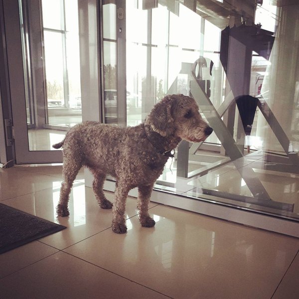 Посетитель Тойота Центра Павлодар. Пока хозяин обслуживался у сервис-консультанта, верный друг не сводил с него (с хозяина) преданных глаз, с места не сходил, на посторонних людей не смотрел. Вот это воспитание!
