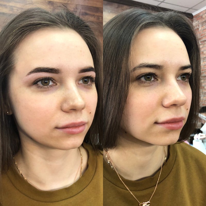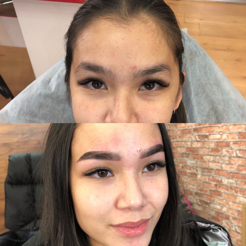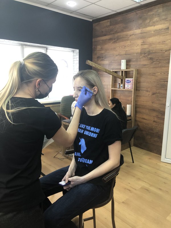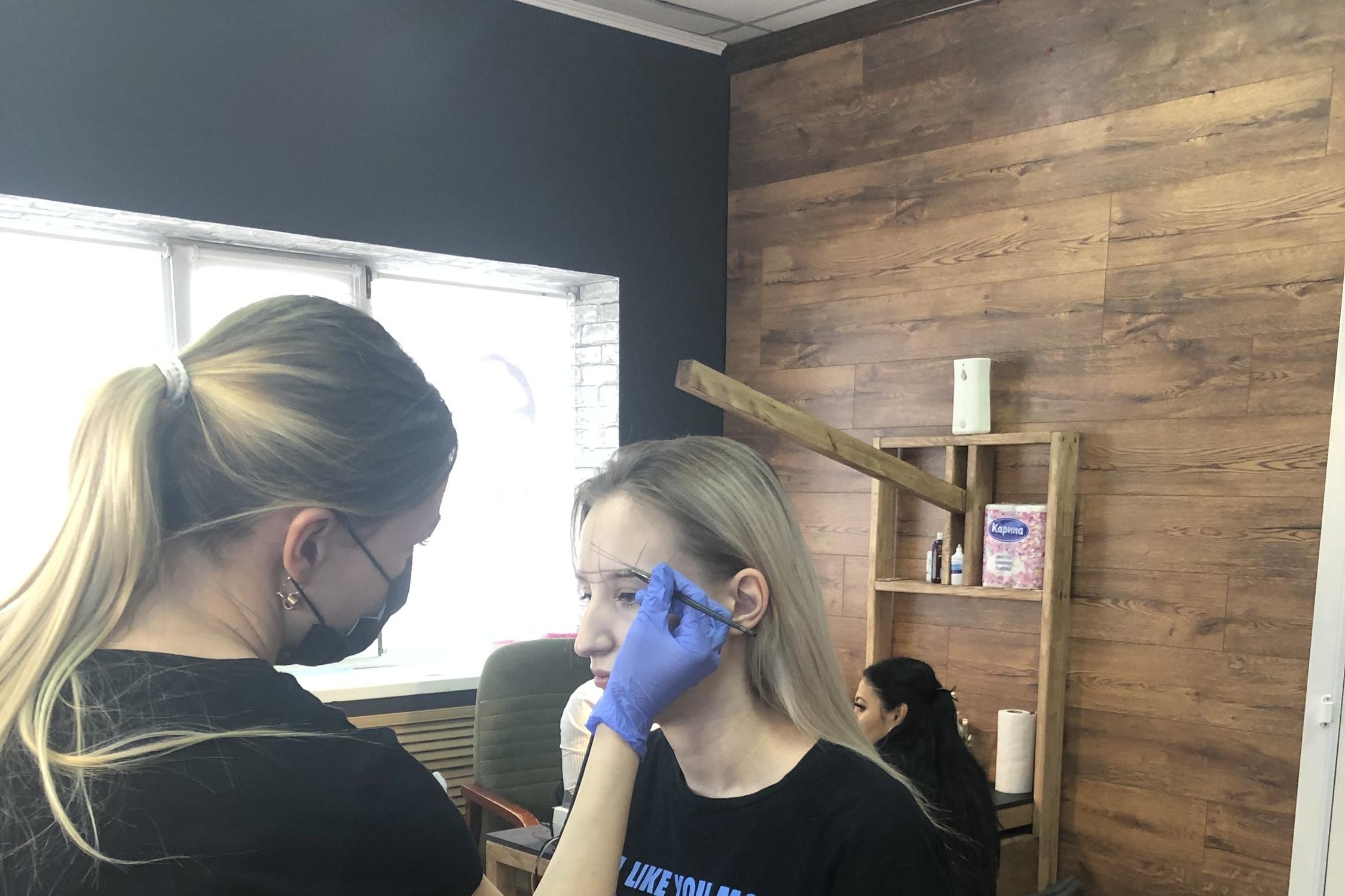 Сотрудники студии красоты Брежнев выполняют коррекцию и окрашивание бровей.