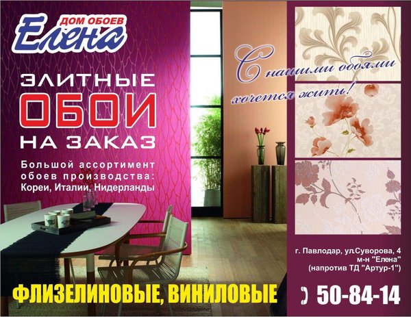 Огромный выбор обоев для вашего Дома. Только у нас Вы найдете эксклюзивные обои на заказ, которых нет у других, более 2000 видов. Ждем Вас по адресу: ул.Суворова 4 (напротив Артура 1), тел: Тел:.