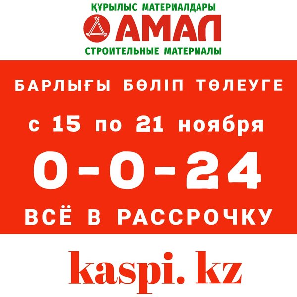 УСПЕЙТЕ ПРИОБРЕСТИ ДО 15 МАРТА У НАС С KASPI.KZ! ____________________ ВСЁ В РАССРОЧКУ С KASPI. KZ ____________________ Осталось совсем немного времени! До конца этой недели! ____________________ ⠀ с 2 марта по 15 марта в приложении Kaspi.kz все товары строительного магазина «Амал» — в рассрочку до 12 месяцев без переплаты и комиссий! ____________________ Ждем Вас по адресам: ⠀ ул.Малая объездная, 6 с 9.00 до 19.00 без перерывов и выходных