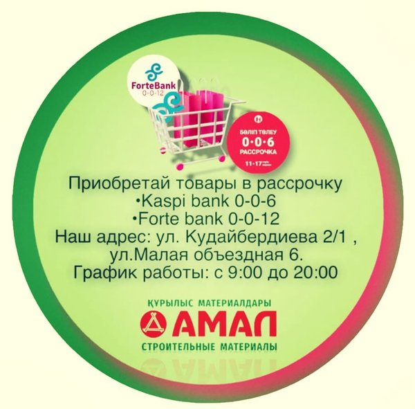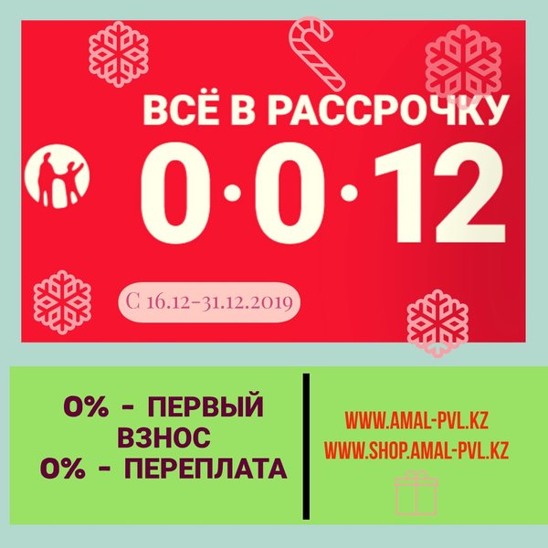 Новогодняя рассрочка 0-0-12 в строительном магазине «Амал» с Kaspi.kz‼ _______________________________________________ Дорогие покупатели! В преддверии новогодних праздников стартует рассрочка на все товары от Kaspi банка! 0️⃣% переплаты‼ 0️⃣% предоплаты‼ Рассрочка действует с 16 по 31 декабря! ⏳ ️ Все акции нашего магазина не действуют при рассрочке _______________________________________________ Мы ждем Вас по адресу: ⠀ ул.Малая объездная, 6 с 9.00 до 19.00 без перерывов и выходных