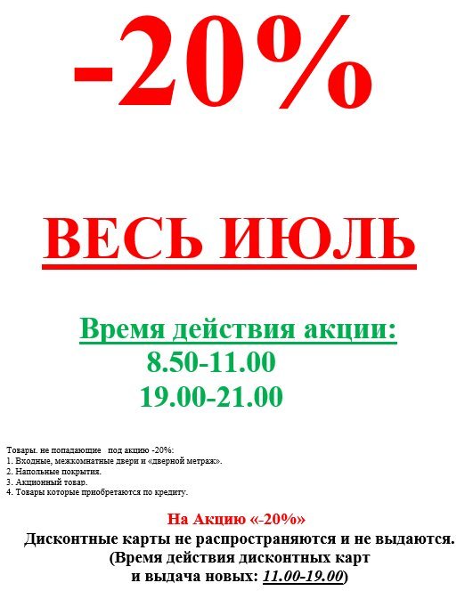 Дисконтная карта на 5%!! ____________________________________ При покупке товара от 30 000 тенге мы дарим Вам дисконтную карту со скидкой 5%! ⠀ Скидка действует почти на все товары, кроме: напольные покрытия (линолеум, ламинат, ковролин); акционные товары, т.е. реализуемые по специальной цене; металлические двери. ⠀ Для оформления карты при себе необходимо иметь уд. личности! ________________________________________ ⠀ Ваша дисконтная карта ждет Вас по адресу: ⠀ ул.Малая объездная, 6 с 9.00 до 19.00 без перерывов и выходных