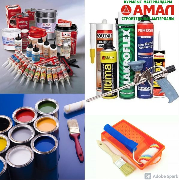 ры,такие как валики,кисти,кюветки,растворители и многое другое. Не маловажную роль в ремонте и строительстве играет герметик. Герметики одновременно обладают уплотнительными, изолирующими и клеящими свойствами.В ассортименте нашего магазина представлено множество видов этих материалов от ведущих мировых и российских производителей – Вы обязательно найдете именно то, что вам необходимо. Ждем Вас за покупками!!! Наш адрес: ул.Малая объездная, 6 С 9.00 до 20.00 без перерыва и выходных Тел.: ⠀ Ул. Кудайбердиева, 2/1 С 9.00 до 20.00 без перерывов и выходных Тел.: