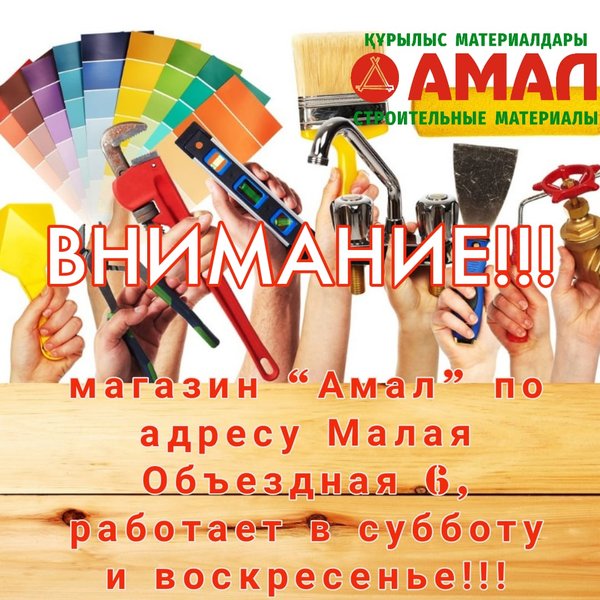ВНИМАНИЕ!!! Рады сообщить что наш магазин строительных товаров «Амал», который находиться по адресу ул. Малая Объездная, вновь возобновляет свою работу в субботу и воскресенье!! Ждем Вас!!! Наш адрес: Ул. Кудайбердиева, 2/1 С 9.00 до 20.00 без перерывов и выходных Тел.: ул.Малая объездная, 6 С 9.00 до 20.00 без перерыва и выходных Тел.:,