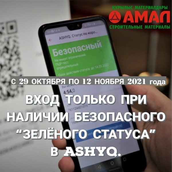 Уважаемые наши покупатели! Согласно новому постановлению #24 об ограничительных карантинных мерах на территории Павлодарской области:С 29 октября по 12 ноября 2021 года работа всех объектов по режиму красной зоны, участвующих в проекте Ashyq возможна при наличии «зелёного статуса» у сотрудников и посетителей. Это значит что вход в наш магазин только при наличии безопасного «зелёного статуса» в Ashyq. Это официальное постановление, условие которого мы соблюдаем! Очень надеемся на ваше понимание!