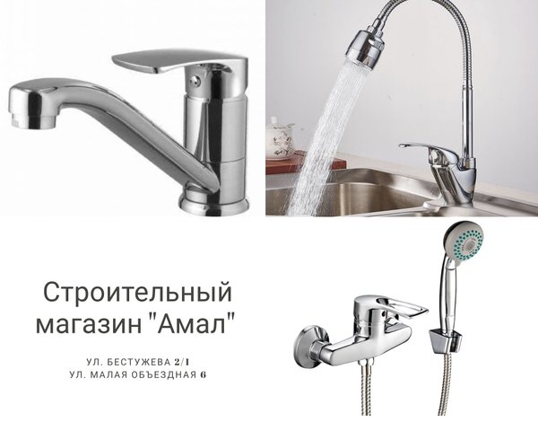 ют кухонные изделия диспенсером и отдельным краном для питьевой воды. ⠀ 1. Кран-буксовые смесители для кухни Классический вариант с двумя маховиками ремонтировать не очень сложно – любой слесарь справится. Однако если руки хозяйки в тесте или в масле, то краны неизбежно будут испачканы – иначе их не откроешь. Да и воды прилично утекает через такой смеситель. ⠀ 2. Однорычажные смесители для кухни Включаемые одним нажатием пальца или тыльной стороны ладони, они не боятся грязных рук и весьма актуальны во время приготовления пищи. Поэтому «однорукие» смесители появляются во всё большем количестве кухонь, вытесняя оттуда вентильные краны. Корпус их может цельным или состоящим из поворотных деталей. ⠀ 3. Поворотный корпус с гибким изливом– удобство и практичность. Такая конструкция позволяет легко отмыть запачканную мойку, так как подает воду на максимальную площадь. Все виды кухонных смесителей представлены в широчайшем ассортименте на полках Строительного магазина «Амал». Консультанты помогут с выбором, чтобы на Вашей кухне оказался именно Ваш смеситель, с учетом дизайна, функционала и эргономики! ________________________ ⠀ Ждем Вас по адресам: ⠀ ул.Малая объездная, 6 с 9.00 до 19.00 без перерывов и выходных