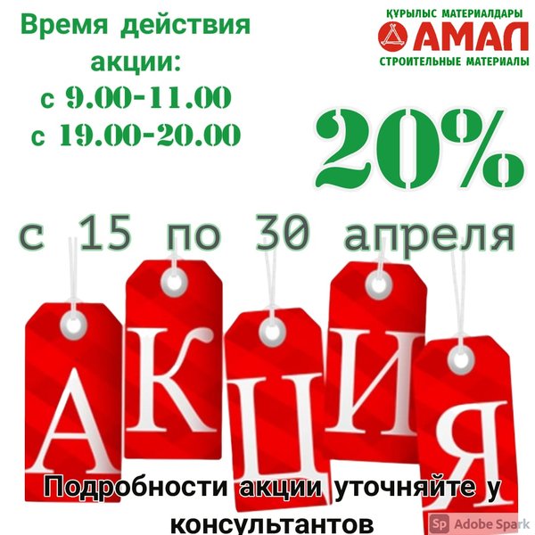 Не пропустите!!!! Только в строительном магазине «Амал» Только для Вас наши уважаемые покупатели, есть специальное предложение - купить товар по эксклюзивно низким ценам!!!!! С 15 апреля по 30 апреля мы предлагаем Вам скидку- 20%. Строительному сезону — Старт вместе с магазином «Амал»!!!!!!! Время действия акции : с 9:00 до 11:00 с 19:00 до 20:00. Внимание!!! Скидка не действует на: 1.Входные,межкомнатные двери«дверной метраж». 2.Напольные покрытия. 3.Акционный товар. 4.Товары которые приобретаются по кредиту. Во время проведения акции дискон… — Читать дальше