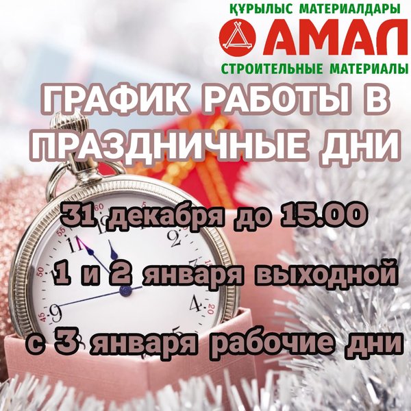 Новогодний график работы‼ ______________________________ ⠀ В период праздников наш строительный магазин «Амал»работает 31 декабря с 9.00 до 15.00. ⠀ 1—2 декабря ВЫХОДНЫЕ ДНИ ⠀ Желает весёлых и добрых праздников нашим дорогим покупателям! ______________________________ Ждем Вас с 3 декабря по адресу: ⠀ ул.Малая объездная, 6 с 9.00 до 19.00 без перерывов и выходных