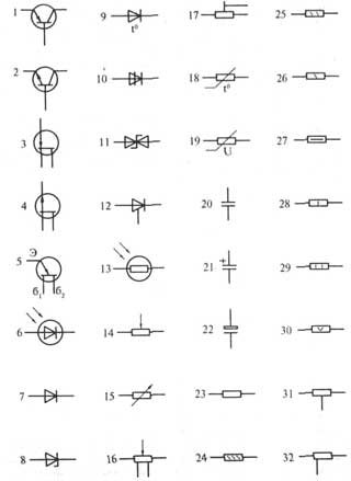 направлении; 11 стабилитрон (диодолавинный выпрямительный) с двусторонней проводимостью, 12 тиристор триодный. 13 фоторезистор, 14 переменный резистор, реостат, общее обозначение, 15 переменный резистор, 16 переменный резистор с отводами, 17 построечный резистор-потенциометр; 18 терморезистор с положительным температурным коэффициентом прямого нагрева (подогрева), 19 варистор, 20 конденсатор постоянной емкости, общее обозначение, 21 конденсатор постоянной емкости поляризованный; 22 конденсатор оксидный поляризованный электролитический, общее обозначение; 23 резистор постоянный, общее обозначение; 24 резистор постоянный с номинальной мощностью 0, 05 Вт; 25 резистор постоянный с номинальной мощностью 0, 125 Вт, 26 резистор постоянный с номинальной мощностью 0, 25 Вт, 27 резистор постоянный с номинальной мощностью 0, 5 Вт, 28 резистор постоянный с номинальной мощностью 1 Вт, 29 резистор постоянный с номинальной мощностью рассеяния 2 Вт, 30 резистор постоянный с номинальной мощностью рассеяния 5 Вт; 31 резистор постоянный с одним симметричным дополнительным отводом; 32 резистор постоянный с одним несимметричным дополнительным отводом;