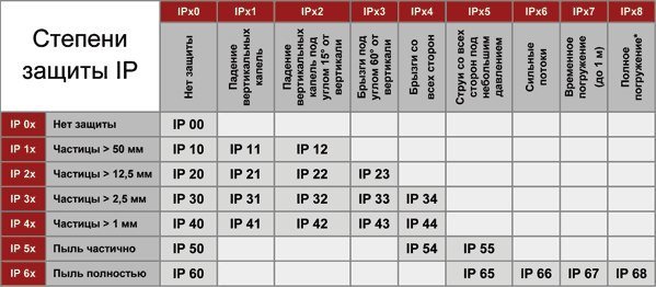мм. Допустимое применение: в обычных помещениях. 3 — защита от частиц размеромот 2,5 мм. Допустимое применение: в обычных помещениях. 4 — защита от частиц размером от 1 мм. Допустимое применение: в обычных помещениях. 5 — частичная защита от пыли. Допустимое применение: в изредка пыльных помещениях. 6 — полная защита от пыли. Допустимое применение: в постоянно пыльных помещениях. Вторая цифра (от 0 до 9) показывает стойкость к воздействию влаги. Чем больше цифра — тем выше защита: 0 — защиты нет. Допустимое применение: в сухих помещениях. 1 — от вертикально падающих капель. Допустимое применение: во влажных помещениях с устройством в заданном вертикальном положении. 2 — от капель воды, падающих под углом 15. Допустимое применение: во влажных помещениях. 3 — от наклонно падающих брызг, угол наклона до 60. Допустимое применение: места, подвергающиеся дождю, но не струям снизу. 4 — от брызг. Допустимое применение: места, подвергающиеся дождю и струям (например, станция с прохождением транспортных средств). 5 — от водяных струй. Допустимое применение: в местах, подвергающихся мойке струями воды средней мощности. 6 — от мощных водяных струй. Допустимое применение: в местах, подвергающихся энергичной мойке и штормам (например, на пирсах). 7 — от временного погружения в воду. Допустимое применение: во временно затопляемых или надолго оказывающихся под снегом местах. 8 — от продолжительного погружения в воду. Для размещения внутри помещения достаточно степени защиты IP20. В помещениях с повышенной пылью и влажностью, например в подвале или бане, стоит устанавливать устройства со степенью защиты IP54. Для уличного освещения потребуется степень защиты IP65 и выше