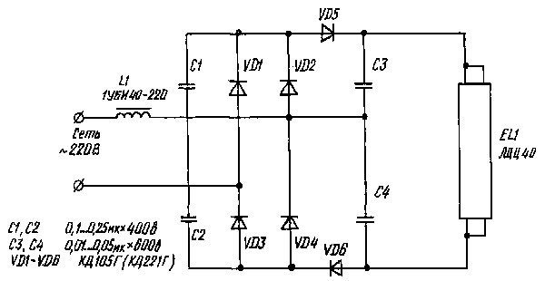 вают. Благодаря токоограничительному дросселю легко устанавливается требуемый режим (для ЛДЦ40 это - 0,2 А). Правда, своя «ложка дегтя в бочке меда» имеется и здесь. Лампы с обеими отгоревшими нитями накала иной раз запускаются не столь безупречно, как хотелось бы. К сожалению, после длительной эксплуатации может проявляться эффект полярности, свойственный и другим схемам питания «люминесцентников» постоянным током, когда ЛДЦ или вовсе не загорается, или лишь слабо тлеет. Но стоит поменять полярность включения (вставить лампу в контактные гнезда «задом наперед»), и работоспособность светильника тут же восстановится. В качестве диодов VD1-VD4 можно использовать готовый диодный мост типа КЦ405А, КЦ402Г или их аналоги. Дроссель L1 — от любого светильника с лампами ЛДЦ40, например, 1УБИ40—220. При желании его можно заменить конденсатором. Для ЛДЦ40 требуется около 6 мкФ, рабочее напряжение 400 В. Правда, при такой замене схема будет работать намного хуже, чем с дросселем, обеспечивающим более надежное и мягкое включение лампы. При использовании данной разработки для бесстартерного запуска ЛДЦ80 нужно увеличить емкость конденсаторов С1 и С2 до 0,5 мкФ, а СЗ и С4 — до 0,022 мкФ с заменой диодов и дросселя на более мощные аналоги. Вместо последнего, например, можно применить 1УБИ80—220. Конденсаторы ввиду их малых емкостей, как и используемые диоды, легко встраиваются практически в любой промышленный светильник. Снаружи остается лишь дроссель, который можно оформить в виде приставки, удобно стыкуемой с остальной схемой.
