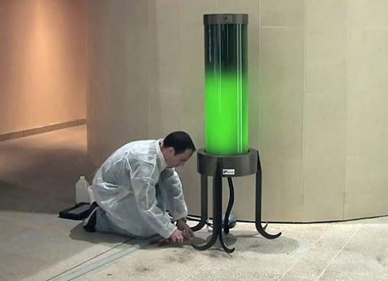 уха, а также производить энергию, создаваемую в процессе фотосинтеза и углеродного преобразования, для освещения. Автором этих необычных ламп с водорослями является французский биохимик Пьер Калежа (Pierre Calleja). Лампа это цистерна, заполненная водой и водорослями, которые преобразуют углекислый газ из воздуха в свет в дневное время, генерируемая энергия накапливается в аккумуляторах, которые поставляются с емкостью. Ночью аккумуляторы создают яркое зеленое свечение. Благодаря водорослям, лампа может стать мощным инструментом в борьбе за сохранение выбросов углекислого газа в норме, лампы также могут быть использованы в подземных гаражах. Морские водоросли могут работать с искусственными выбросами углекислого газа и гореть, если это необходимо.