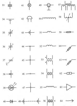 лением; 45 линия электрической связи с двумя ответвлениями; 46 группа проводов, подключенных к одной точке электрическою соединения. Два провода; 47 четыре провода, подключенных к одной точке электрическою соединения; 48 батарея из гальванических элементов или батарея аккумуляторная; 49 кабель коаксиальный. Экран соединен с корпусом; 50 обмотка трансформатора, автотрансформатора, дросселя, магнитного усилителя; 51 рабочая обмотка магнитного усилителя; 52 управляющая обмотка магнитного усилителя; 53 трансформатор без сердечника (магнитопровода) с постоянной связью (точками обозначены начала обмоток); 54 трансформатор с магнитодиэлектрическим сердечником; 55 катушка индуктивности, дроссель без магнитопровода; 56 трансформатор однофазный с ферромагнитным магнитопроводом и экраном между обмотками; 57 трансформатор однофазный трехобмоточный с ферромагнитным магнитопроводом с отводом во вторичной обмотке; 58 автотрансформатор однофазный с регулированием напряжения; 59 предохранитель; 60 предохранитель выключатель; б1 предохранитель-разъединитель; 62 соединение контактное разъемное; 63 усилитель (направление передачи сигнала указывает вершина треугольника на горизонтальной линии связи); 64 штырь разъемного контактного соединения;