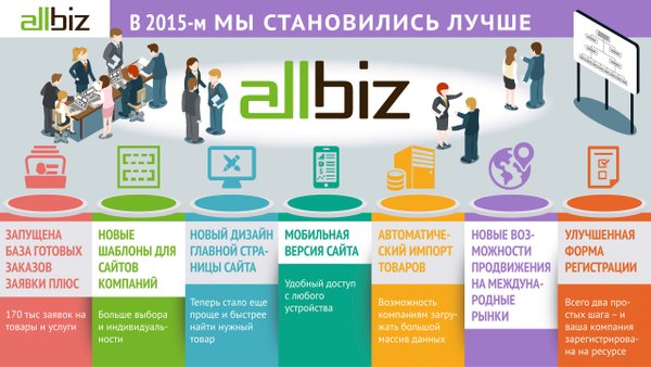 В 2015 году компания Allbiz потрудилась очень плодотворно. Многие нововведения и инициативы привлекли на ресурс новых продавцов и заказчиков. Узнайте подробнее о наших начинаниях и достижениях