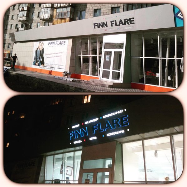 Printside Pv (23.06.2016): Магазин FINN FLARE. Здесь также используется материал Grossbond. Листы имеют длину 4 м, что позволило облицевать козырек с меньшим количеством швов. Свечение оставляет желать лучшего, но что поделать…корпоративые требования.