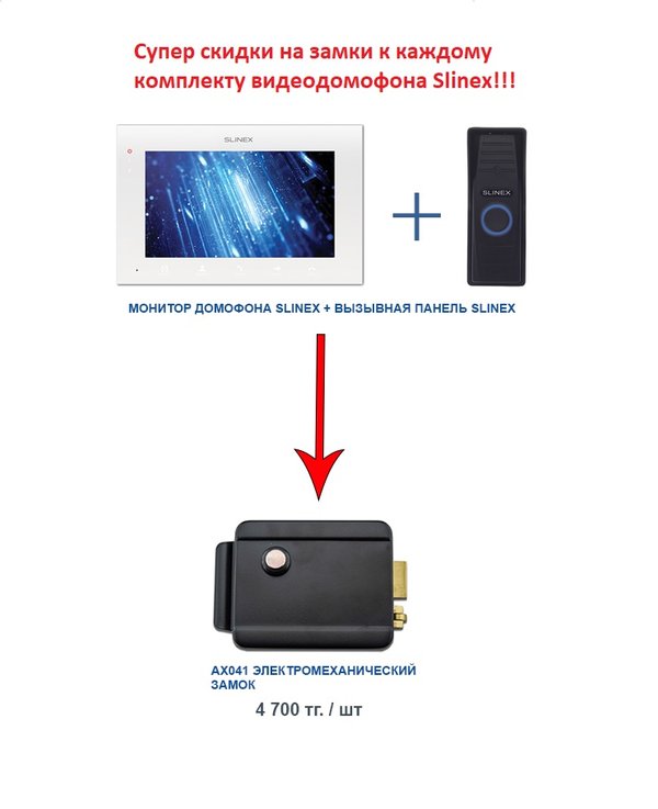 Условия акции: 1. Приобретая комплект домофона Slinex, не важно готовый комплект или по отдельности, вы получаете уникальную скидку на электромагнитный или электромеханический замок. 2. В акции принимают участие любые комплекты домофона Slinex. Основное условие чтобы в одном документе реализации обязательно был как минимум один монитор домофона и одна панель вызова. 3. Скидка действует единоразово. 4. Скидка предоставляется на такое же количество замков, сколько и комплектов видеодомофона.