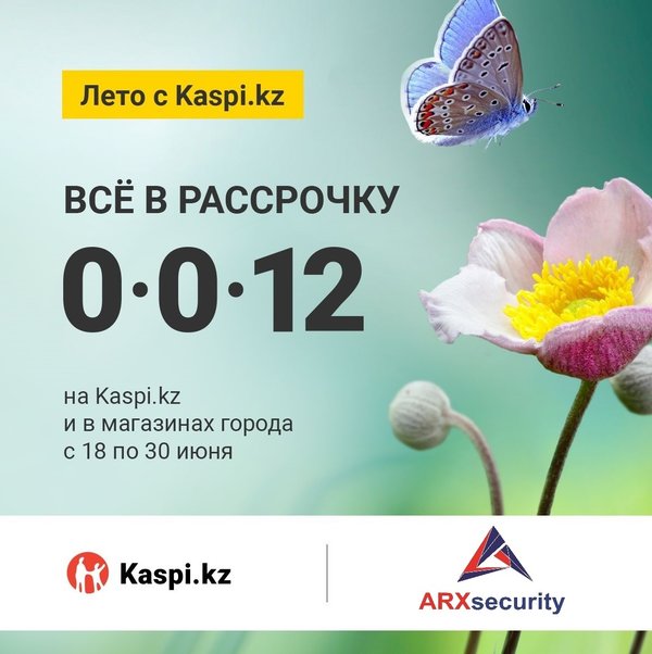 Внимание!!! Уважаемые покупатели! С 18 по 30 июня в ARX security пройдёт совместная акция по льготному кредитованию с участием Каспий банка. В эти дни у нас вы сможете приобрести товары и услуги в рассрочку до 12 месяцев. За подробностями Вы можете обращаться по тел., либо по адресу: ул. Торайгырова 79/1, БЦ «RESPECT» 2эт.