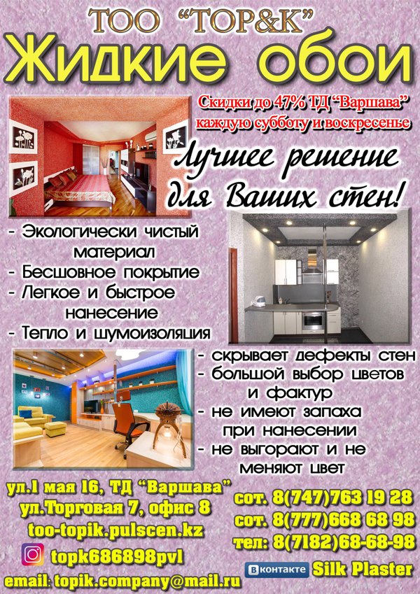 Осень,самое время доделывать ремонт,и конечно самое время заняться внутренней отделкой. Сделать ваш дом уютным вам помогут жидкие обои. Почувствуйте себя творцом, экспериментируйте с цветом и фактурой.Ваш комфорт в ваших руках! Жидкие обои SILK PLASTER представлены в торговых домах. -ТД «Империал», -ТД «Дом Обоев», -ТД » Строй Арсенал», -ТД «Амал», -ТД «Практик », -магазин обоев «Елена», -м-н «Стройтовары », -» 12 месяцев», -м-н «краски», -» Керамир»