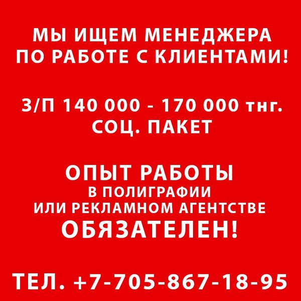 вами, как с профессионалом. По необходимости выполнять логистическую работу по отправке заказов для иногородних клиентов. Что требуется от специалиста? Очень приветствуется опыт работы в продаже полиграфических / рекламных услуг! Высшее образование. Коммуникабельность, активность, пунктуальность, работоспособность. Умение убеждать, обучаемость, позитивность Приветствуется успешный опыт холодных звонков. Знание ПК на уровне пользователя. Иметь желание много работать и много зарабатывать. Какие условия? Сдельная система оплаты труда. Корпоративная мобильная связь. Возможность карьерного роста. Поощрение лучших сотрудников (призы по квартальным итогам). Работа офисного характера.